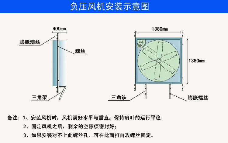 安裝負壓風機:兩人以上配合將負壓風機抬放到安裝支架上,用自攻螺絲將支架和負壓風機底部進行固定。