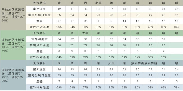 冷風(fēng)機(jī)(又叫環(huán)保空調(diào)或者水空調(diào))降溫原理是:當(dāng)風(fēng)機(jī)運(yùn)行時(shí)進(jìn)入腔內(nèi)產(chǎn)生負(fù)壓,使機(jī)外空氣流過多孔濕潤的濕簾表面迫使過簾空氣的干球溫度降至接近于機(jī)外空氣的濕球溫度,即冷風(fēng)機(jī)出口的干球溫度比室外干球溫度低5-12℃(干熱地區(qū)可達(dá)15℃),空氣愈干熱,其溫差愈大,降溫效果越好。由于空氣始終是從室外引進(jìn)室內(nèi),(這時(shí)候叫正壓系統(tǒng))所以能保持室內(nèi)空氣的新鮮;這樣子說起來大家還是沒有直觀的認(rèn)識和了解,凱美恒特意制作了在不同條件下冷風(fēng)機(jī)的降溫效果數(shù)據(jù)表如下: