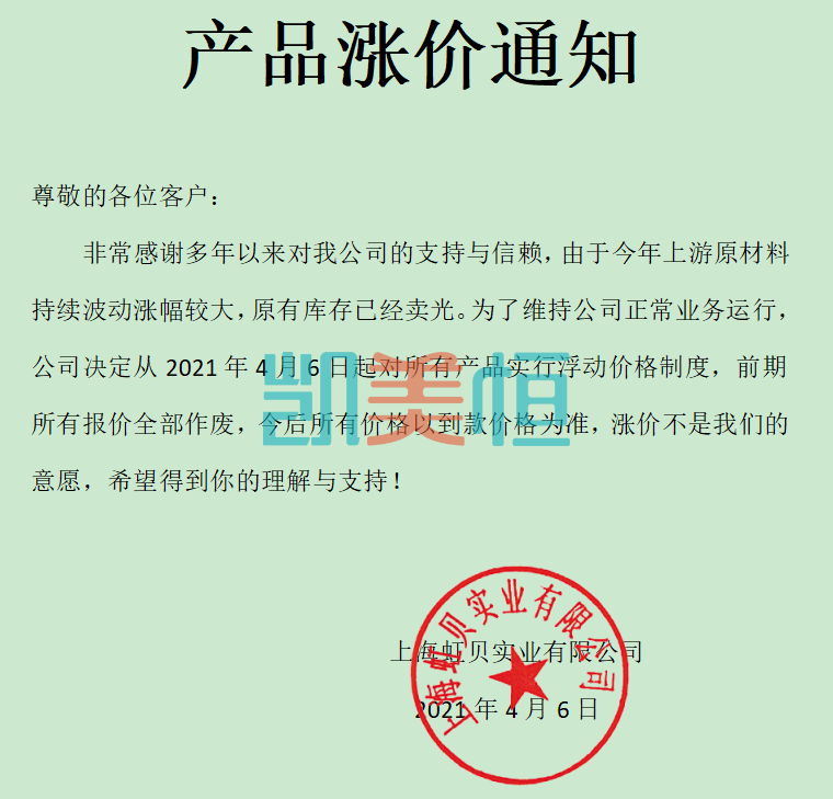 非常感謝多年以來對我公司的支持與信賴,由于今年上游原材料持續(xù)波動漲幅較大,原有庫存已經(jīng)賣光。為了維持公司正常業(yè)務運行,公司決定從2021年4月6日起對所有產(chǎn)品實行浮動價格制度,前期所有報價全部作廢,今后所有價格以到款價格為準,漲價不是我們的意愿,希望得到你的理解與支持!